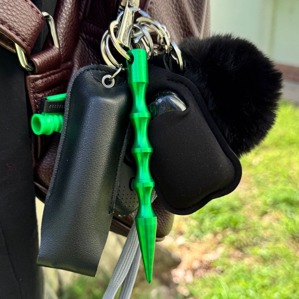 Ключник безпеки Max: сирена, газовий балончик в кейсі, куботан, розбивач-стропоріз, свисток, холдер для антисептика, ремінець, помпон (готовий набір самозахисту), Зелений