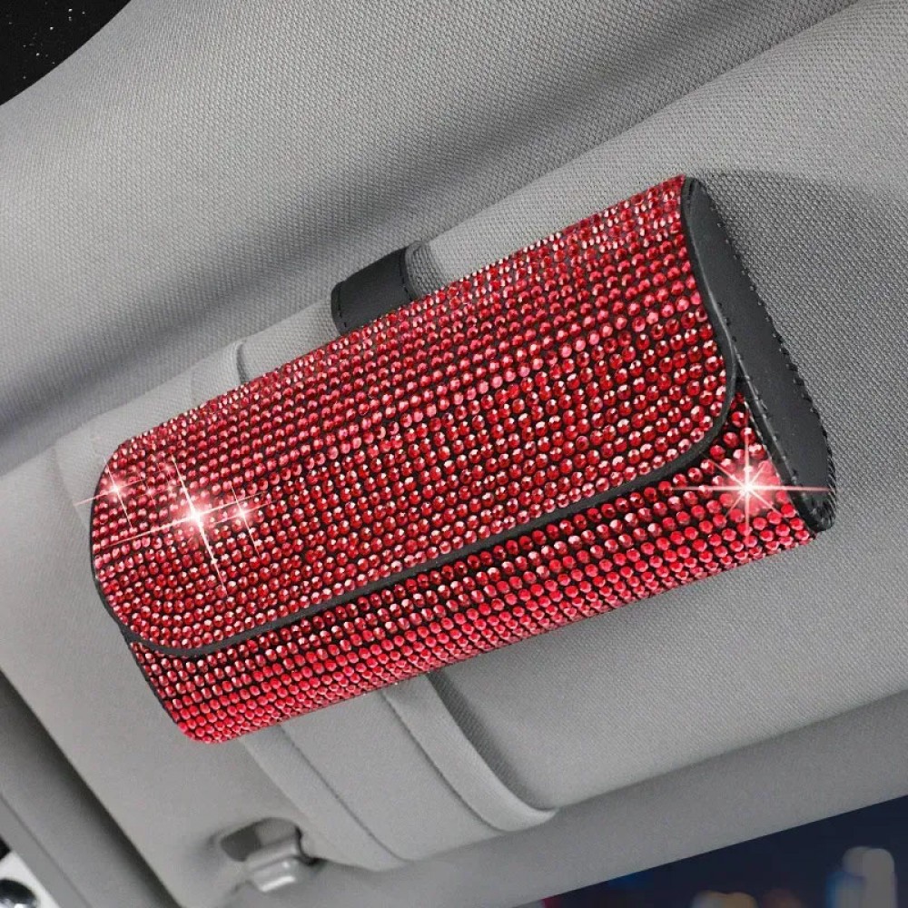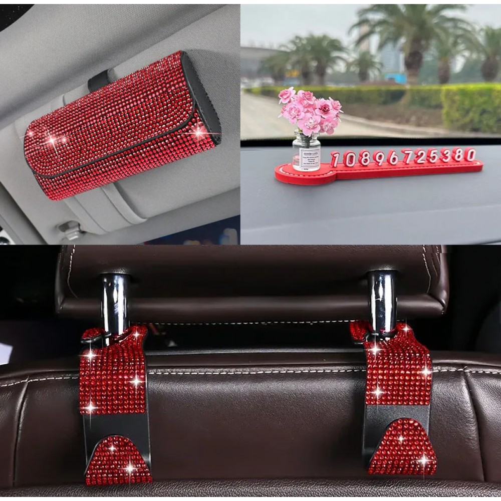 Комплект аксесуарів в авто: чохол для окулярів в стрази, автовізитка паркувальна з квітами, гачок для сумки, Червоний