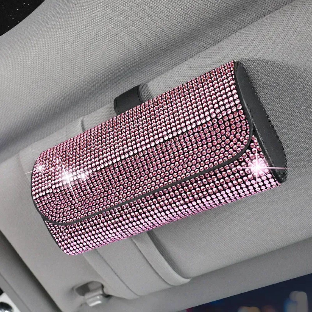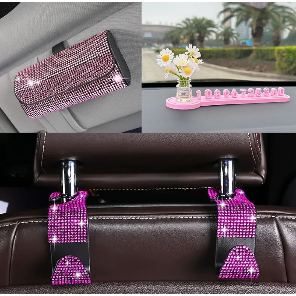Комплект аксесуарів в авто: чохол для окулярів в стрази, автовізитка паркувальна з квітами, гачок для сумки, Рожевий