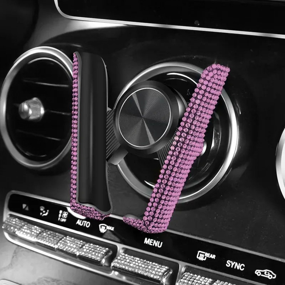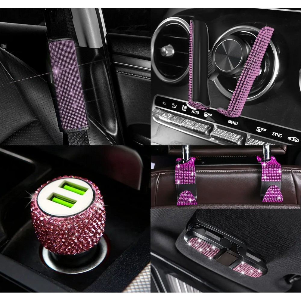 Комплект в стрази: накладка на пасок безпеки, гачки для сумки, тримач окулярів подвійний, зарядка від прикурювача, тримач для телефону, Рожевий