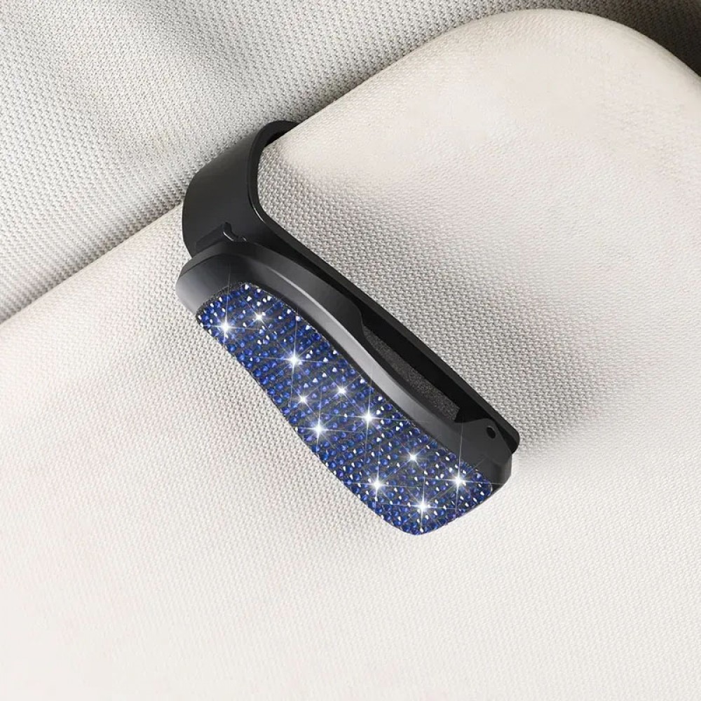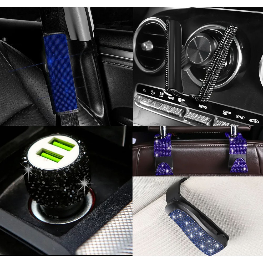 Комплект в стрази: накладка на пасок безпеки, гачки для сумки, тримач окулярів, зарядка від прикурювача, тримач для телефону, Чорний з Блакитним