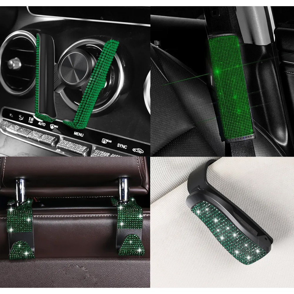 Набір аксесуарів в авто: накладки на пасок безпеки, тримач для окулярів одинарний, гачок для сумки, тримач для телефону, Зелений